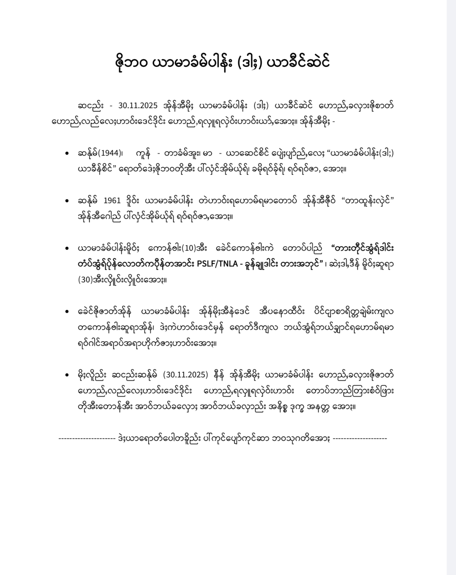 ပလောင်ပြည်နယ်လွတ်မြောက်ရေးတပ်ဦး-PSLF/TNLA ဥက္ကဌ ဗိုလ်ချုပ်ကြီး တားအိုက်ဘုန်း၏ မိခင်ဖြစ်သူ ယာမာခမ်းပါး(ခ)ယာခင်စိန် ဘဝဖြစ်စဥ်အကျဥ်း၂၀၂၅ခုနှစ်၊ ဒီဇင်ဘာ ၃ရက်