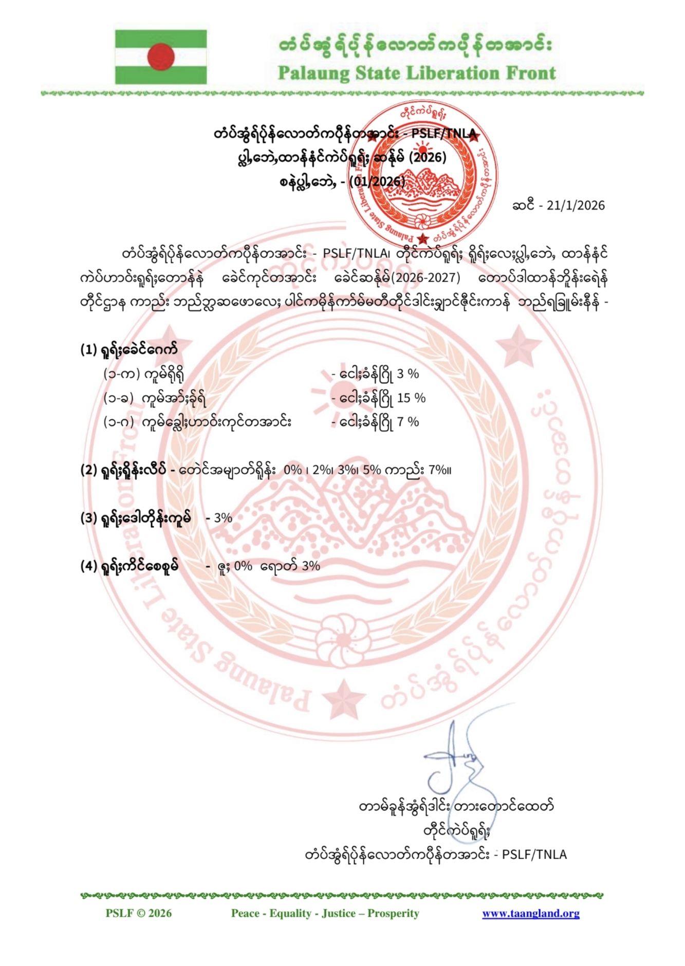 ပလောင်ပြည်နယ်လွတ်မြောက်ရေးတပ်ဦး-PSLF/TNLAမှ အခွန်နှုန်းထားများအား ထုတ်ပြန်ကြေညာခြင်း