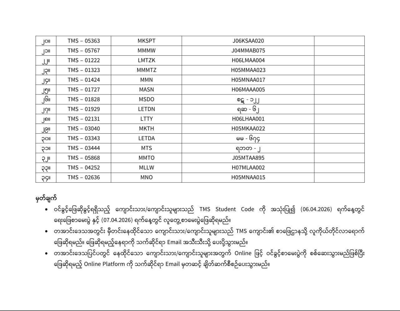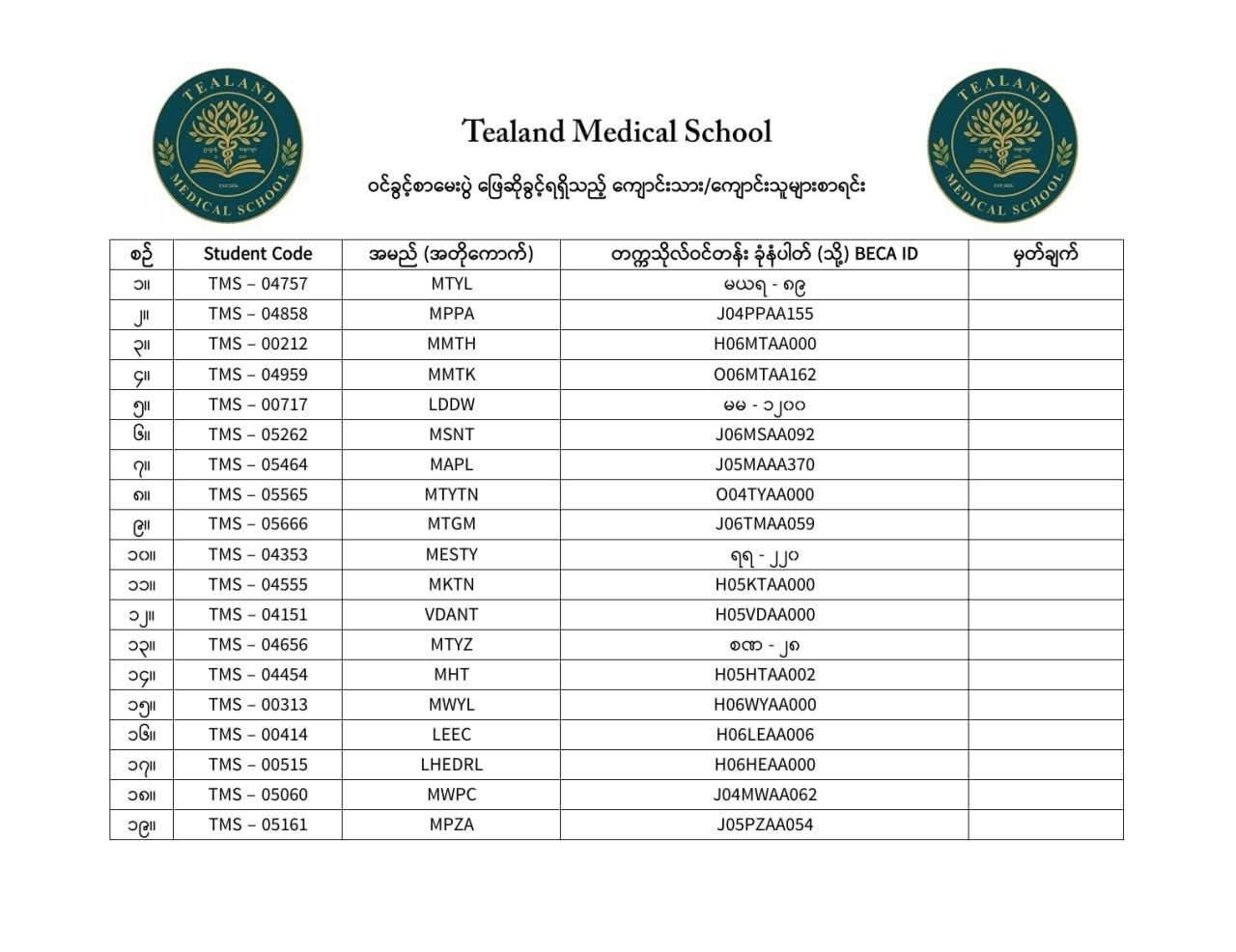 တအာင်းပြည်တွင် ဖွင့်လှစ်မည့် Tealand Medical School (M.B.B.S) အပတ်စဉ် (၁) တွင် လျှောက်ထားသူများအနေဖြင့် ဖြေဆိုခွင့်ရရှိသူများအား TMS Student Code No ဖြင့် အသိပေးကြေညာချက်