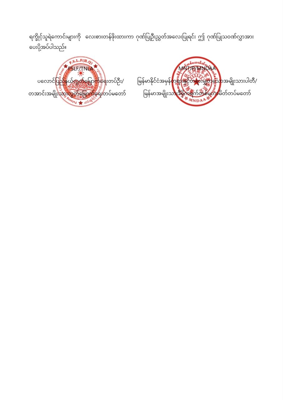 မဟာမိတ်ဖြစ်ကြသည့် MNTJP/MNDAAနှင့် PSLF/TNLAတို့မှ ပေးပို့သည့် ဂုဏ်ပြုသဝဏ်လွှာ