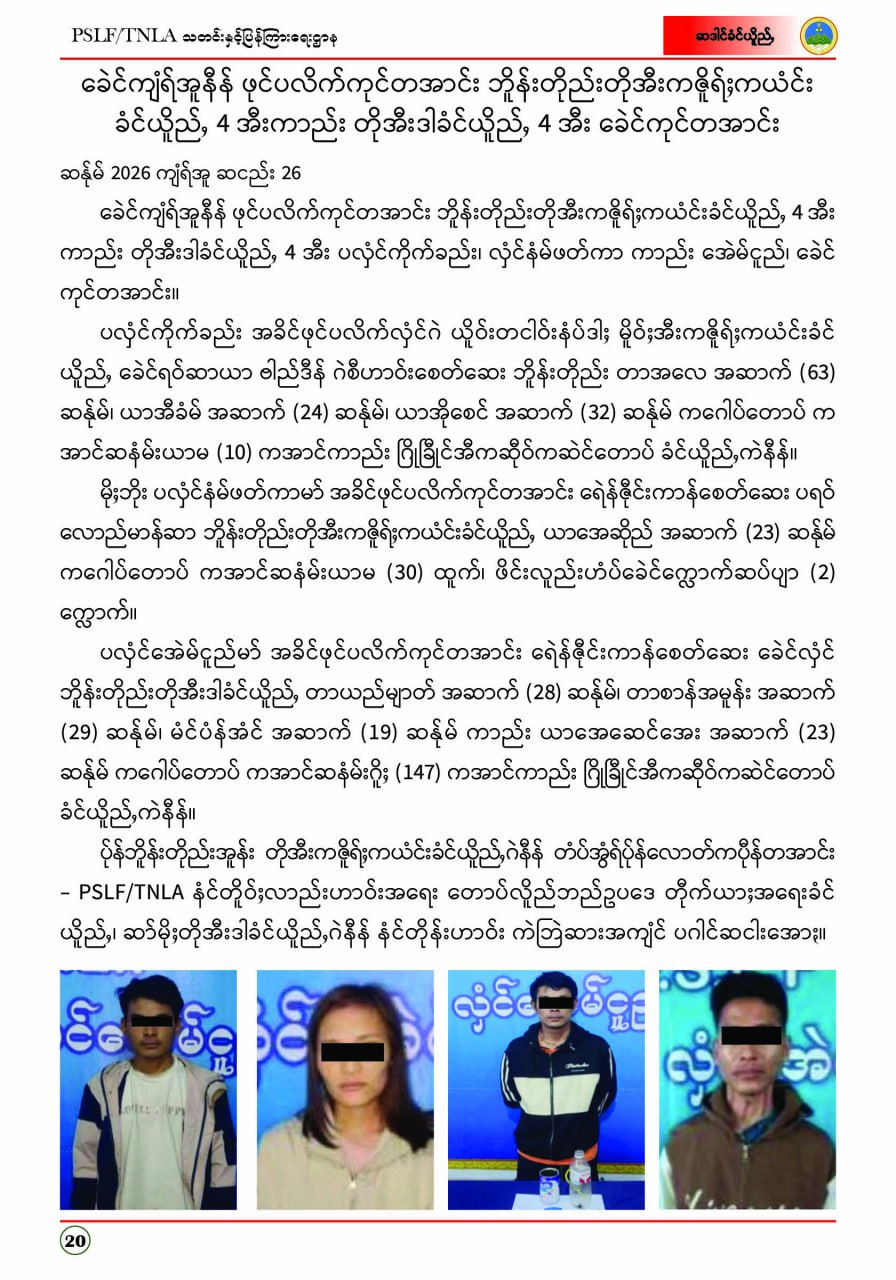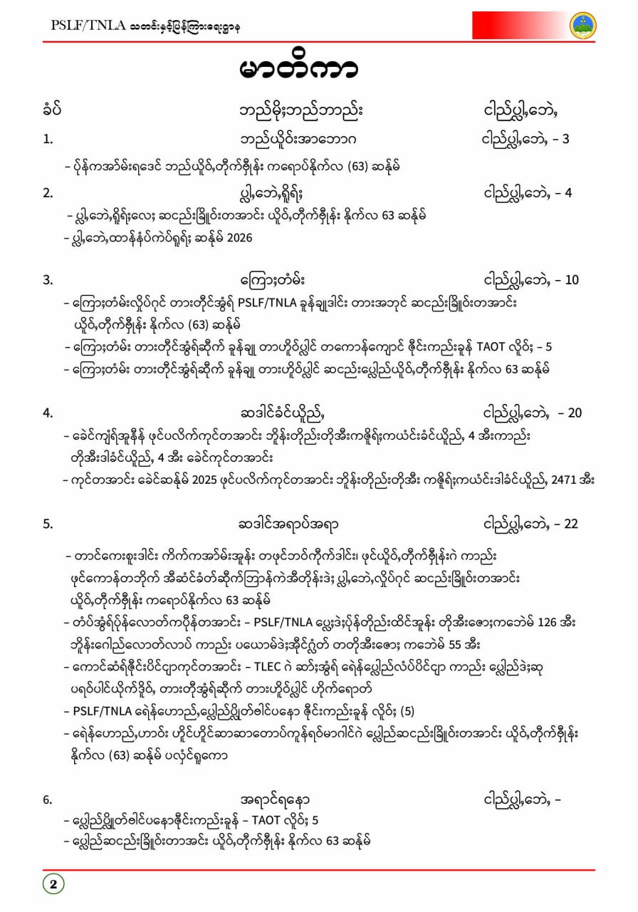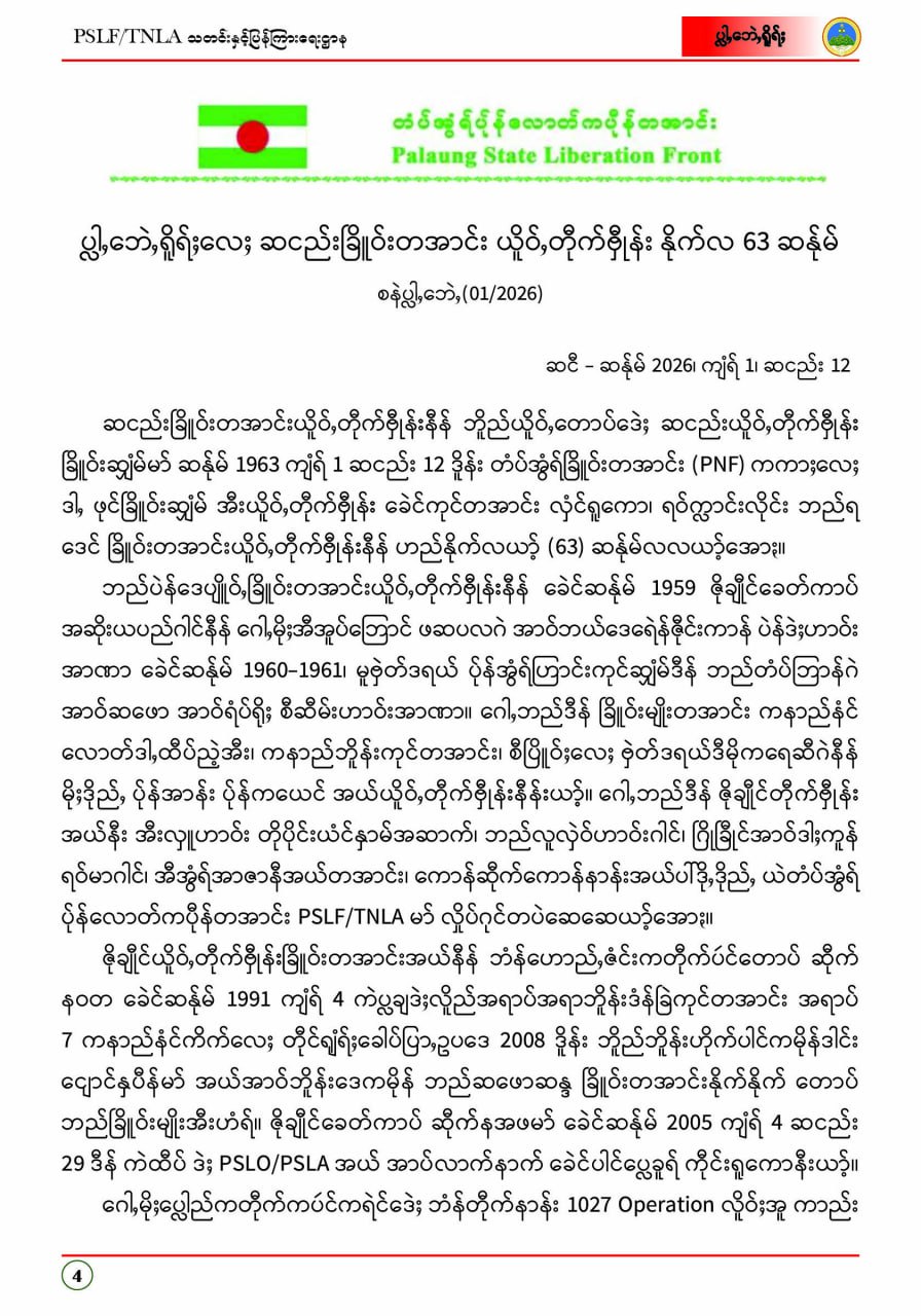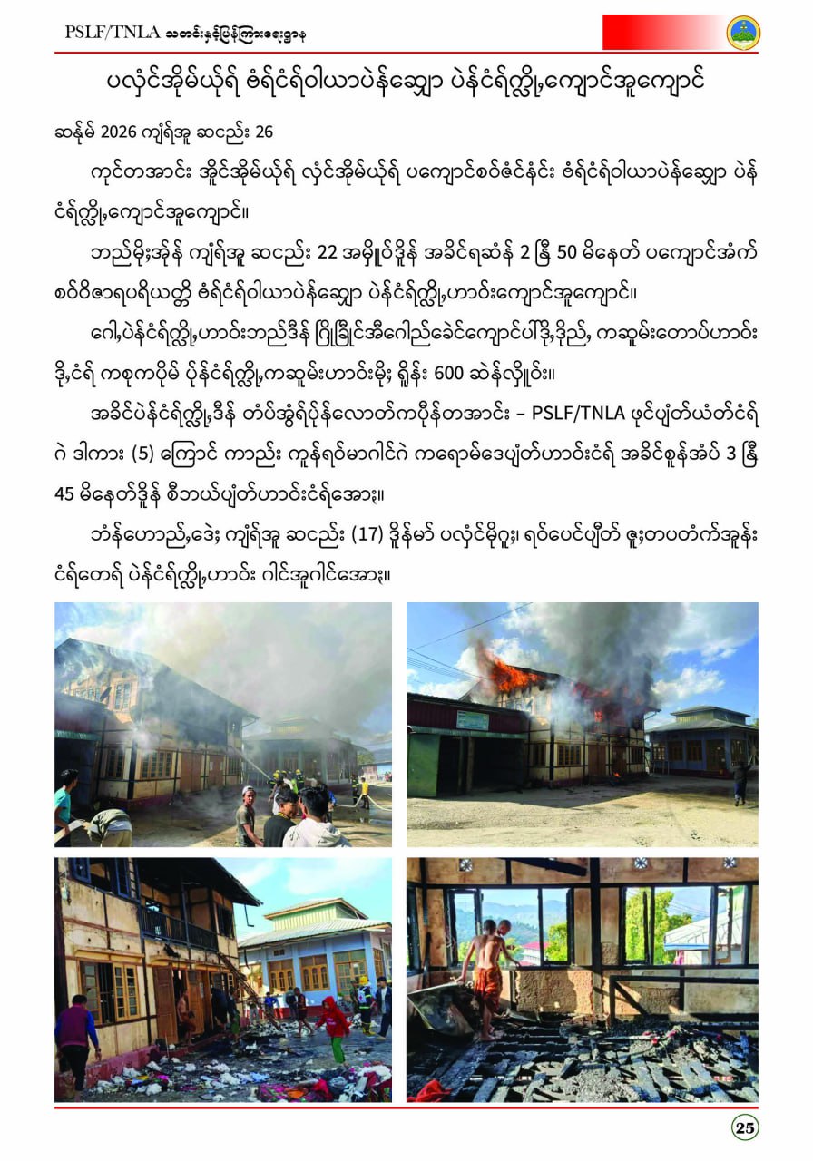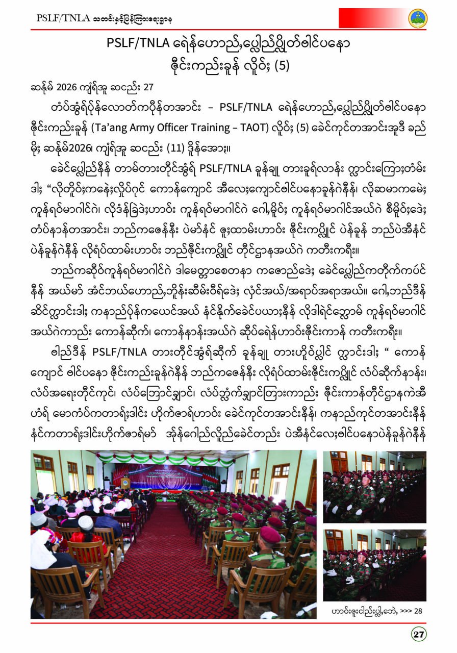 ပလောင်ပြည်နယ်လွတ်မြောက်ရေးတပ်ဦး PSLF/TNLA သတင်းနှင့်ပြန်ကြားရေးဌာန ဇန်နဝါရီလထုတ်စာစောင် တအာင်းပြည်၊ ဖေဖော်ဝါရီ၊ ၂၀၂၆ခုနှစ်