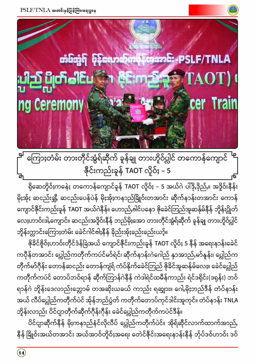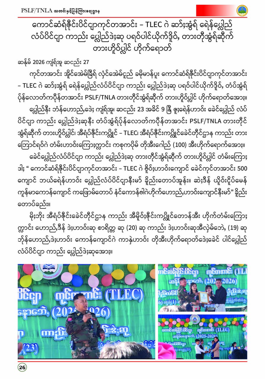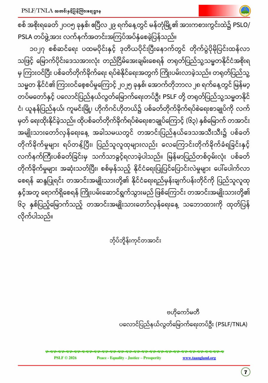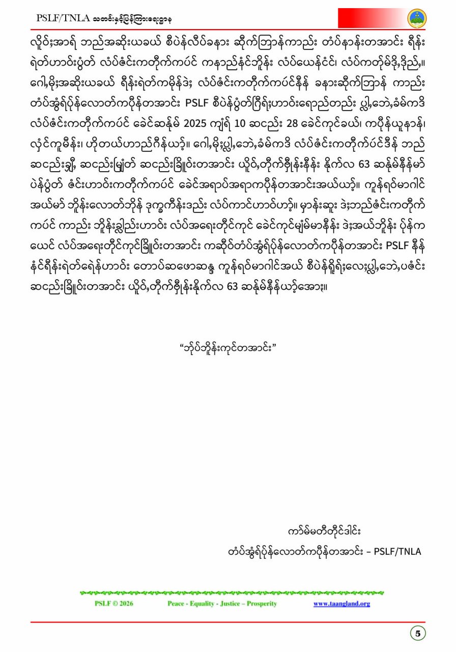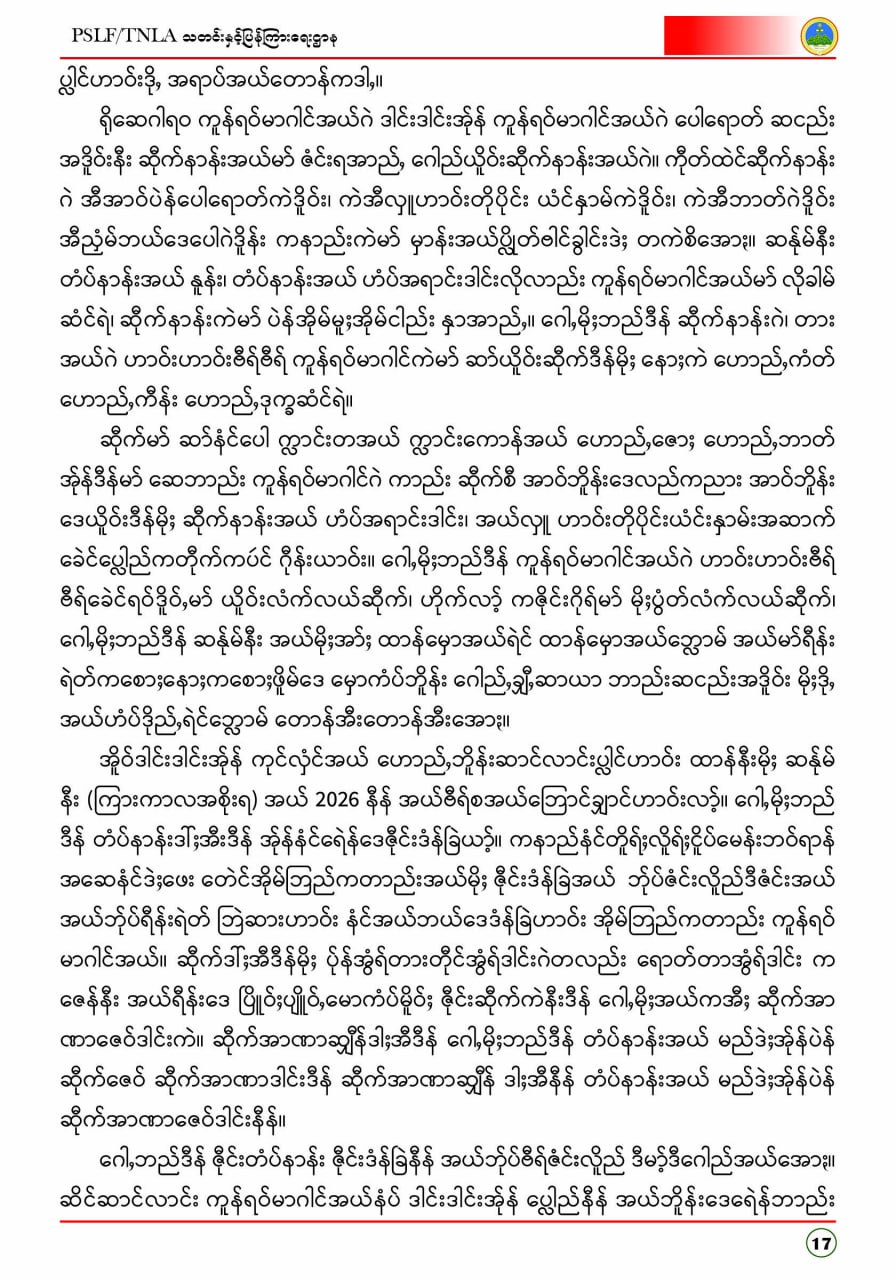 ပလောင်ပြည်နယ်လွတ်မြောက်ရေးတပ်ဦး PSLF/TNLA သတင်းနှင့်ပြန်ကြားရေးဌာန ဇန်နဝါရီလထုတ်စာစောင် တအာင်းပြည်၊ ဖေဖော်ဝါရီ၊ ၂၀၂၆ခုနှစ်