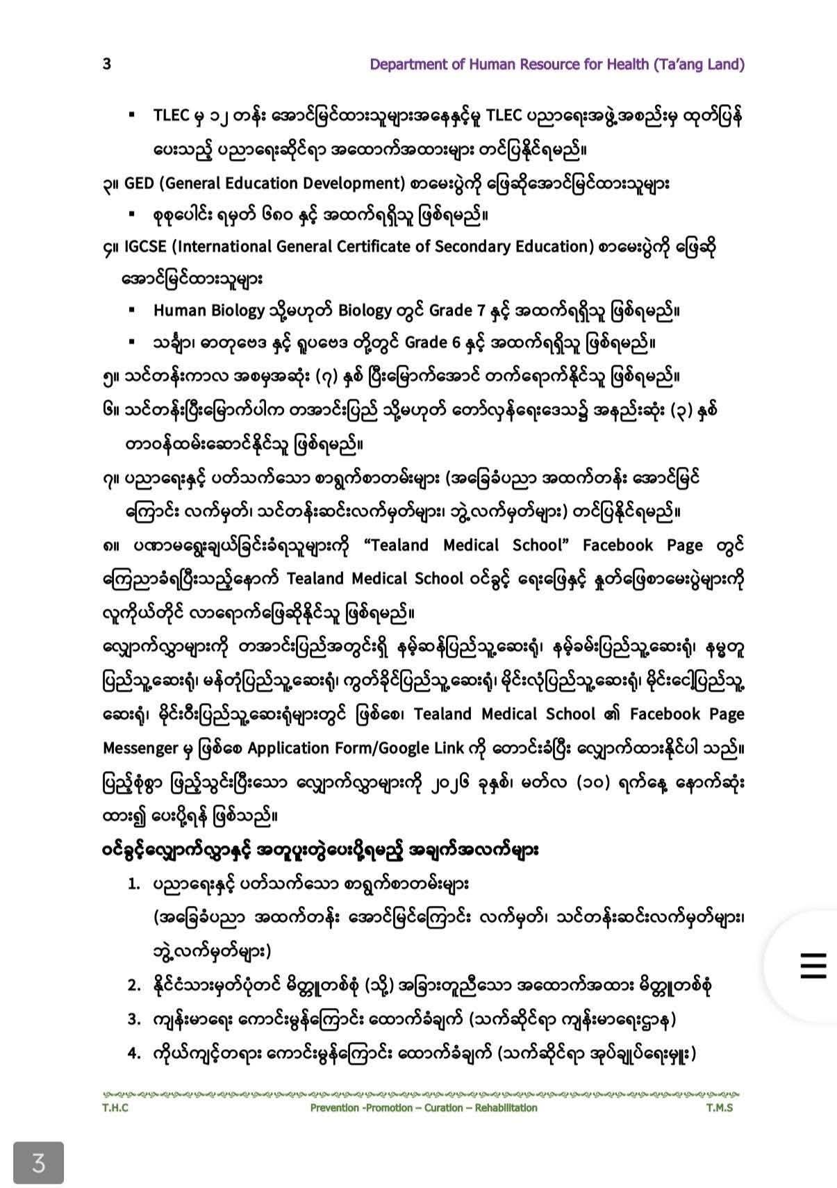 တအာင်းပြည်တွင် “Tealand Medical School” ဖွင့်လှစ်မည့် ဆေးပညာဘွဲ့ (M.B.,B.S) အတွက် အပတ်စဉ်(၁) ဝင်ခွင့်လျှောက်လွှာခေါ်ယူ