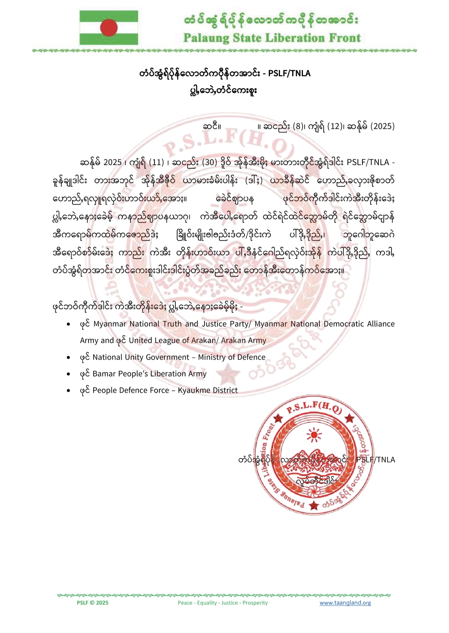 တအာင်းတပ်မတော် ထုတ်ပြန်ချက်