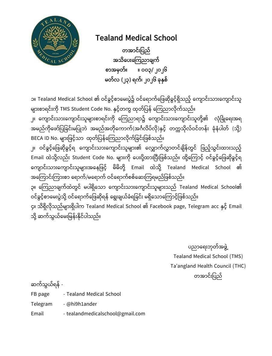 ဆဲႈဒါႇဒီန် ဘည်ကဆီုဝ်ကောန်ကျောင်ဂဲ အီဘိူန်းလီပ်ပ္လါန်ဘေဲႇကာည်း ဆာ်မိူဝ်ႈ အီကဆီုဝ်ကဆဲင် အချာက်ပ်ုန်လိုဆမွံတ်ကဲနီန် ဆိင်ပ္လူႈဆဒိဒဲႈအယ်နံပ် ဘိူန်းအူန်းဆမွံတ်ဒေဲႈ ခေဲင် Official Facebook Page၊ Telegram Account ကာည်း Email အီမိုႈ Tealand Medical School နီန်အောႏ။